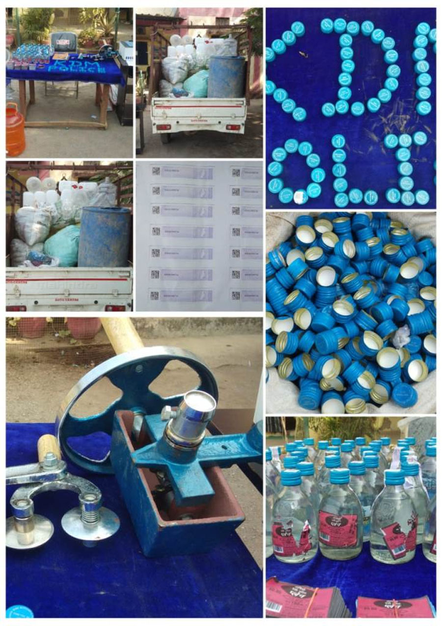 पुलिस को मौके से भारी मात्रा में नकली शराब और उसे बनाने-पैकिंग करने का सामान मिला: