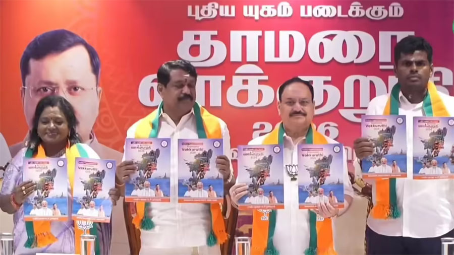 तमिलनाडु चुनाव : भाजपा के ‘संकल्प पत्र’ में महिलाओं के लिए ₹2000 मासिक भत्ता और मुफ्त गैस सिलेंडर का वादा